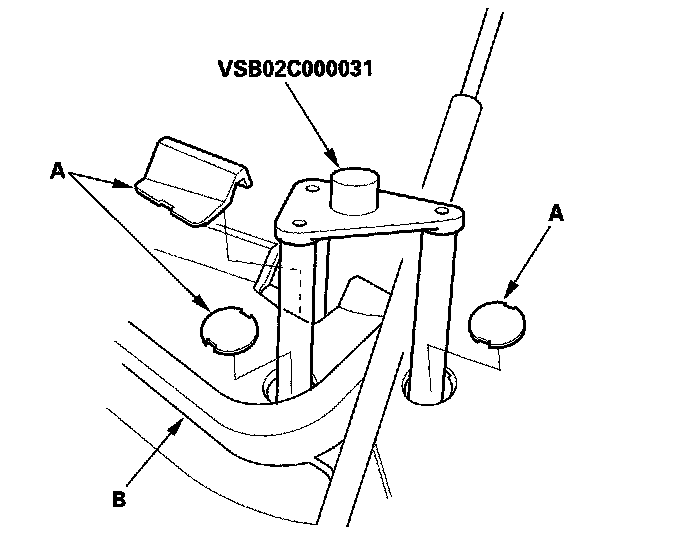 56. Remove the service caps (A) for the front damper flange nuts from the cowl cover (B). Position the engine hanger adapters (VSB02C000031) with the "FRONT" mark facing forward over the damper flange nuts.