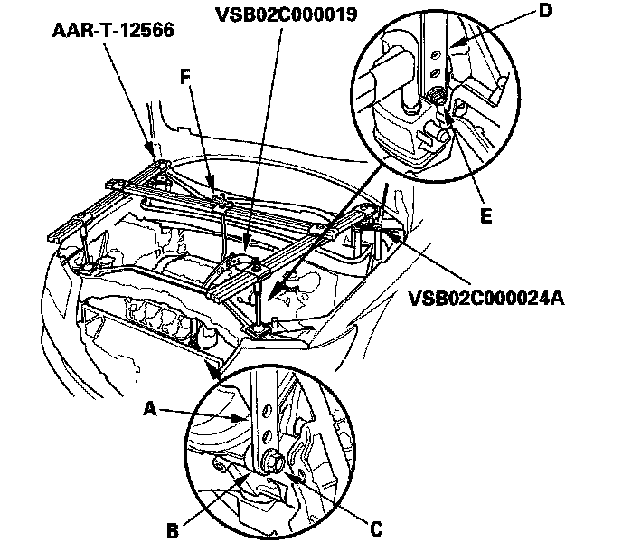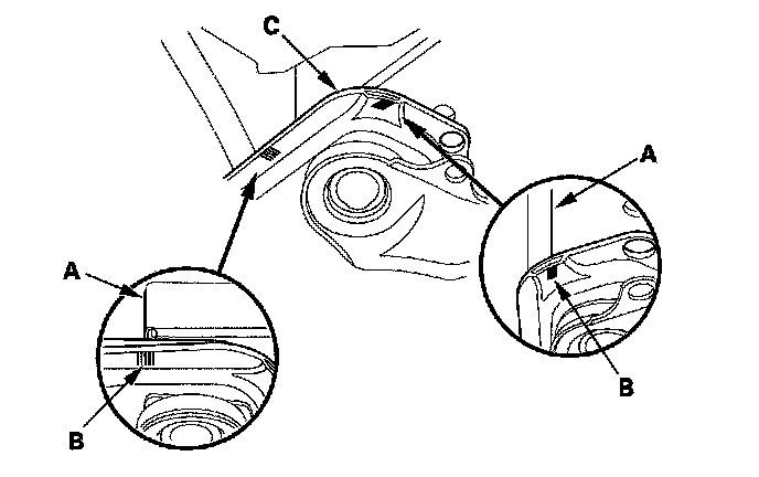 62. Make reference marks (A) on the body across the marks (B) on the edge of the front subframe (C).