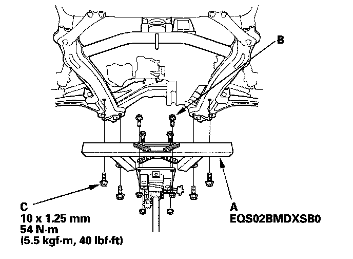 65. Raise the jack to vehicle height, then attach the front subframe adapter to the front subframe using the subframe stiffener mounting bolts (C) and bolt holes.