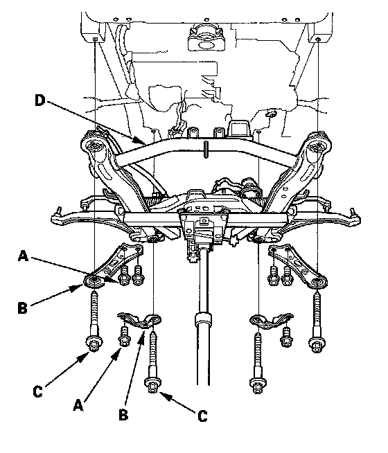 66. Remove the six 12 x 1.25 mm bolts (A) securing the subframe stiffeners (B), the four subframe mounting bolts (C), and the stiffeners, then lower the front subframe (D).