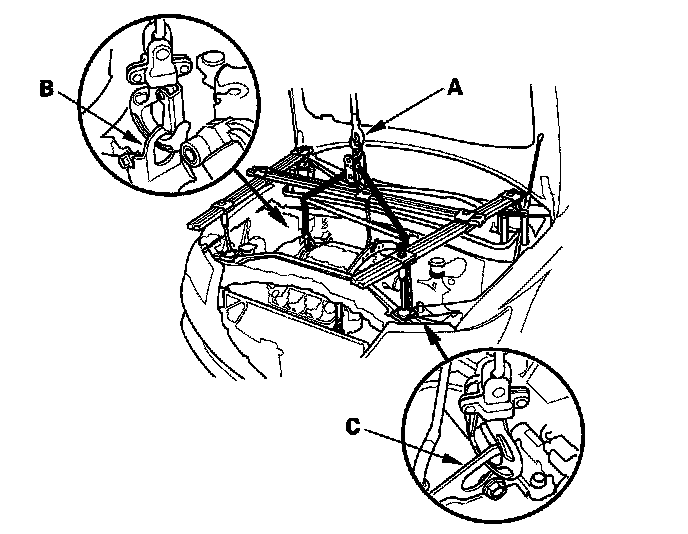 67. Lower the vehicle and attach a chain hoist (A) to the engine hook (B) and transmission hook (C). Lift up on the engine/transmission until it's securely supported by the chain hoist, and remove the engine support hanger from the engine and vehicle.