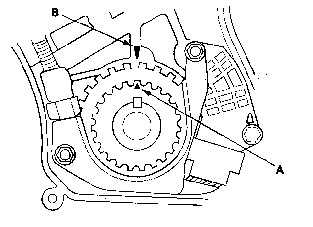 3. Set the timing belt drive pulley to top dead center (TDC) by aligning the TDC mark (A) on the tooth of the timing belt drive pulley with the pointer (B) on the oil pump.