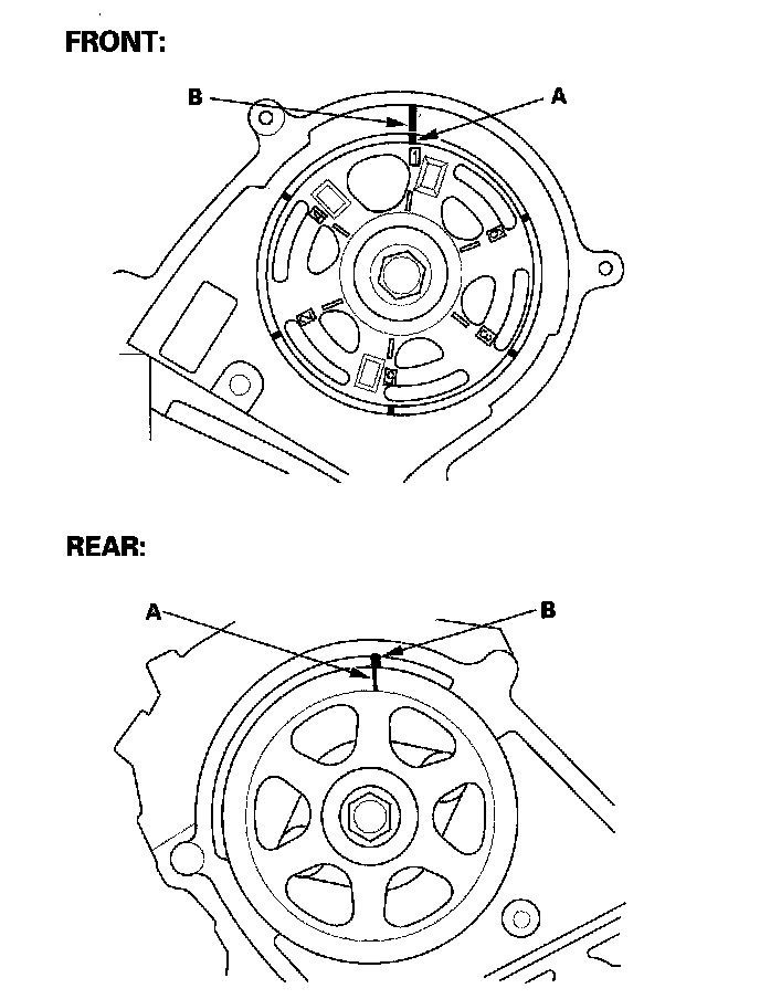 4. Set the camshaft pulleys to TDC by aligning the TDC marks (A) on the camshaft pulleys with the pointers (B) on the back covers.