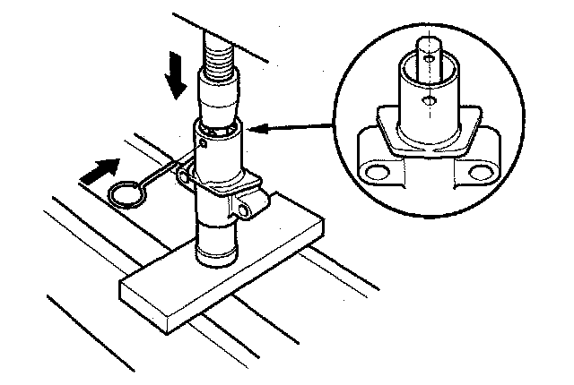8. Use a hydraulic press to slowly compress the auto-tensioner. Insert a 2.0 mm (0.08 in.) pin through the housing and the rod.