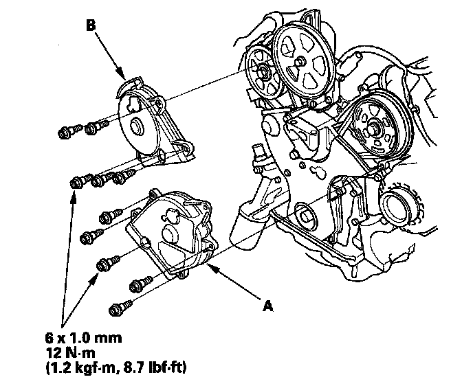 24. Install the upper half of the side engine mount bracket, and tighten the new mounting bolts (A), then tighten the mass damper mounting bolt (B).