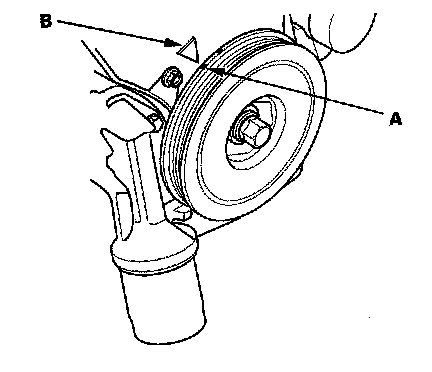 22. Turn the crankshaft pulley so its white mark (A) lines up with the pointer (B).