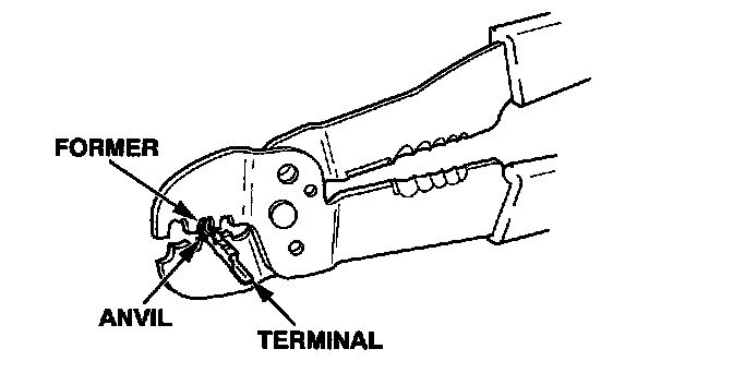 4. Position the terminal in the crimping tool slot with the solid portion of the terminal toward the anvil and the open section toward the former.