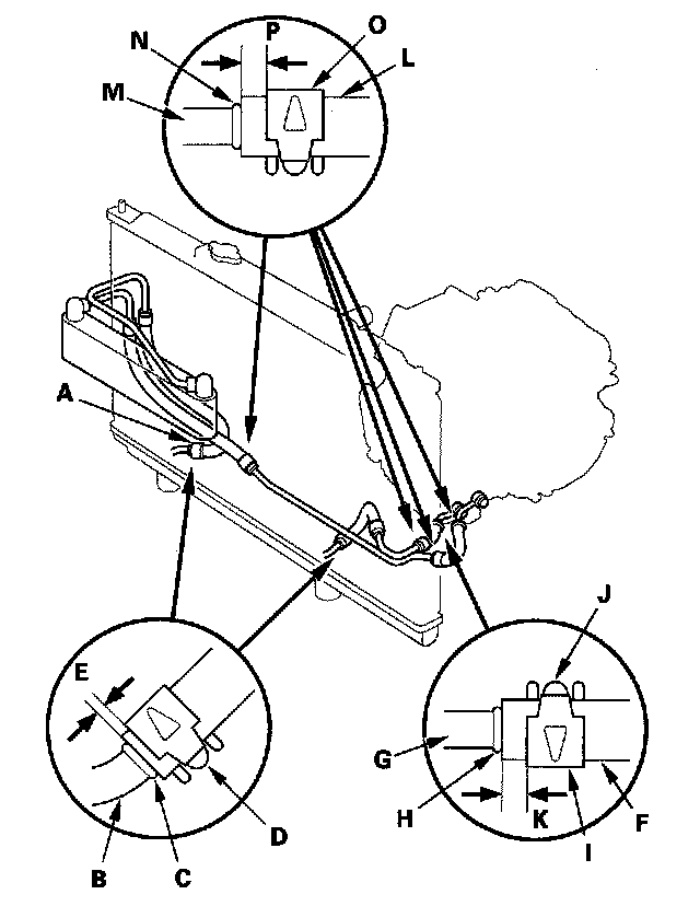 3. Slide the ATF cooler hoses (L) over the ATF cooler lines (M) until the hose ends contact with the bulge (N) of the ATF cooler line, and secure the hoses with the clips (O) at 6-8 mm (0.2-0.3 in.) (P) from the hose end.