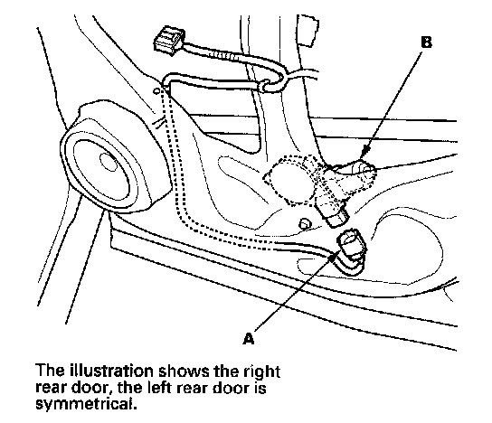 4. Disconnect the 6P connector (A) from the rear power window motor (B).
