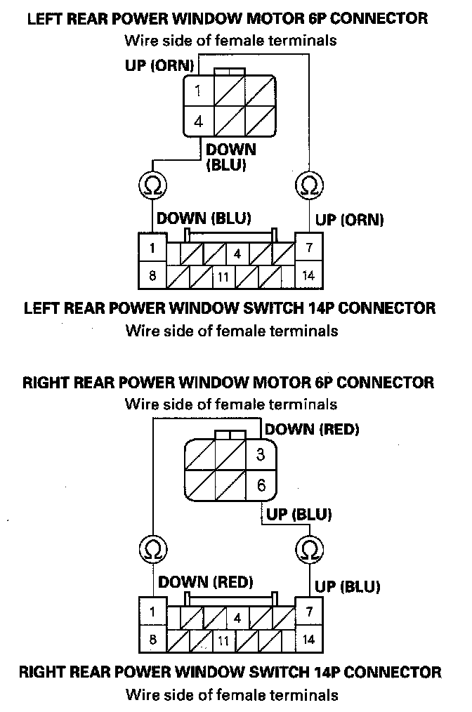 5. Check for continuity between the rear power window motor 6P connector No. 1 [No. 3] and No. 4 [No. 6] terminals and the front rear power window switch 14P connector No. 1 and No. 7 terminals respectively. There should be continuity.