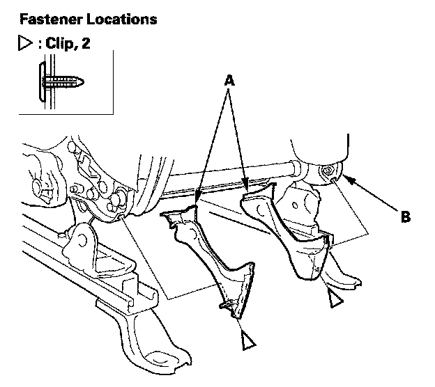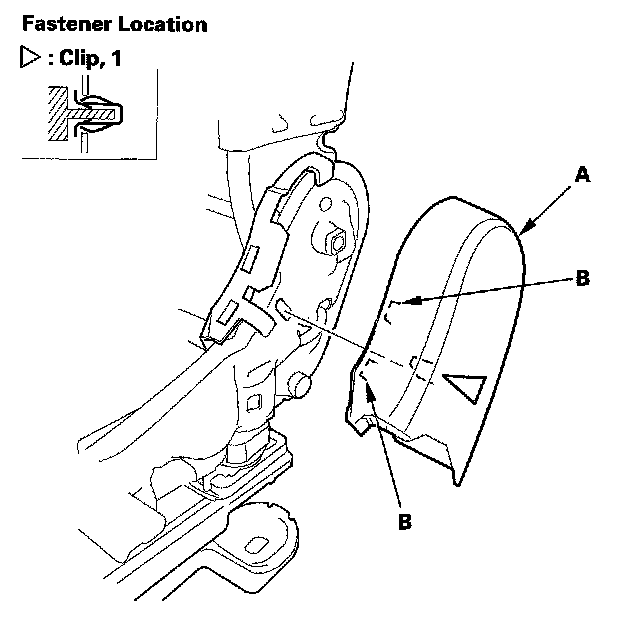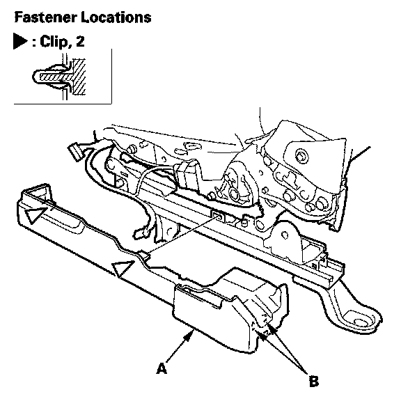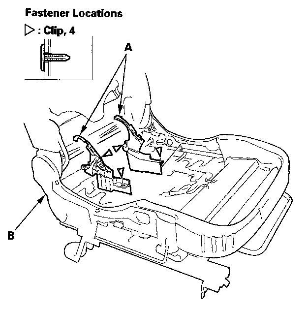 4. Remove the clips, then remove the recline inner covers (A) from the seat frame (B).