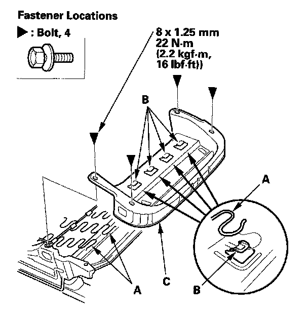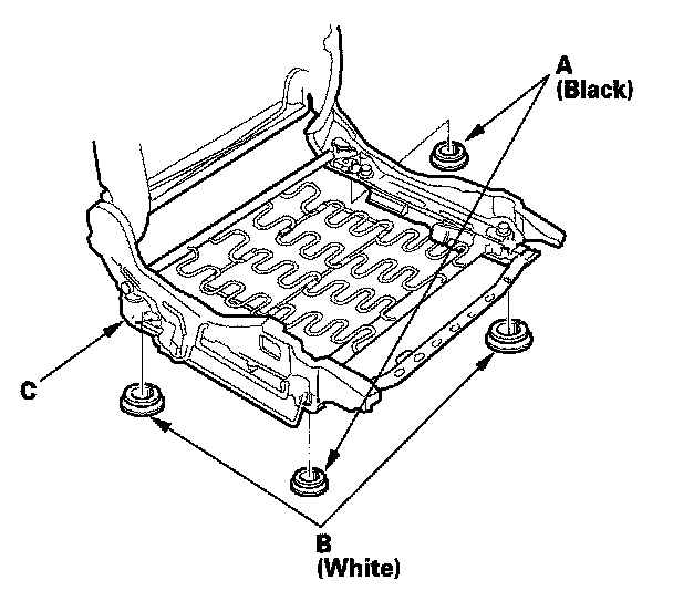 5. Remove the bolts, and release the seat cushion springs (A) from the hooks (B), then remove the seat cushion frame (C).