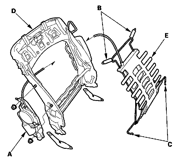 9. Remove the nuts, and remove the lumbar support motor (A). Release the upper springs (B) and lumbar springs (C) from the seat-back frame (D), then remove the front seat lumbar (E).