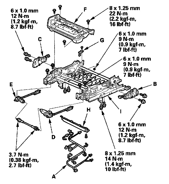10. Disconnect the harness connectors and harness band, and remove the driver's seat harness (A), Remove the rear up-down motor (B), front up-down motor (C), slide motor/left side gear box (D), right side gear box (E), seat cushion frame (F), seat position sensor (G), and harness bracket (H) from the slide/up-down adjuster (I).