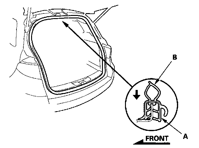 2. Locate the painted alignment mark (A) on the tailgate weatherstrip (B). Align the painted mark with the alignment tab in the center of the tailgate opening, and install the weatherstrip. Make sure it's seated completely and facing in the direction shown. Make sure there are no wrinkles in the weatherstrip.