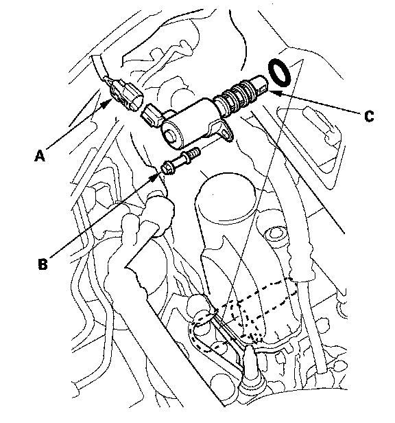 2. Remove the bolt (B) and the VTC oil control solenoid valve (C).