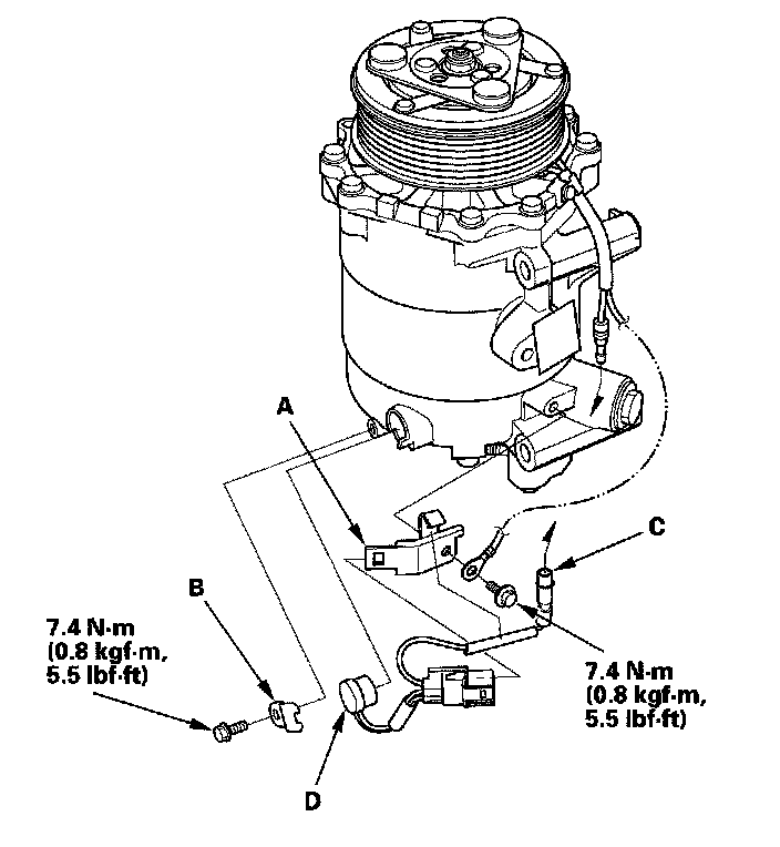 A/C Compressor Thermal Protector Replacement1. Remove the bolt and the stay (A), and remove the bolt and the holder (B). Disconnect the field coil connector (C), then detach the harness clip and remove the thermal protector (D).