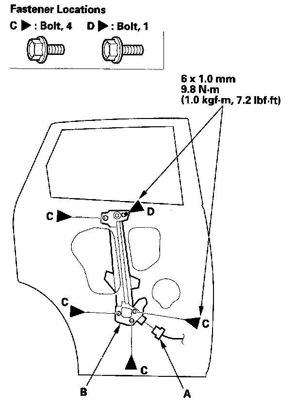 11. Remove the bolts (C), and loosen the bolt (D), then remove the regulator through the hole in the door.