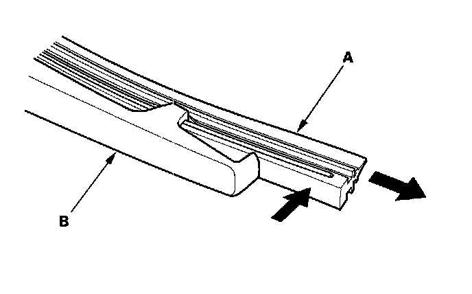 3. Raise the old rubber blade insert (A), and remove it from the wiper blade (B).