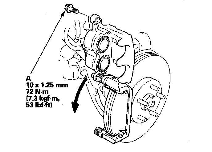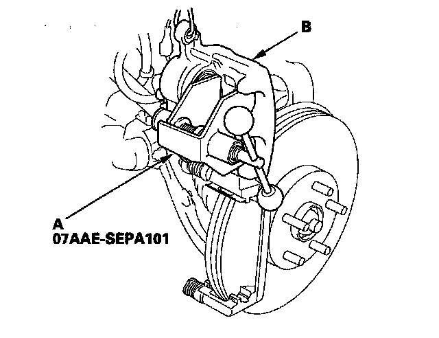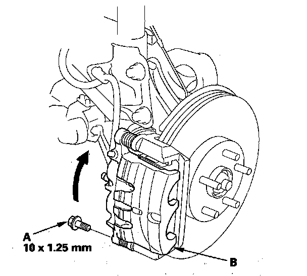 4. Remove the flange bolt (A), and pivot the caliper (B) up out of the way. Check the hose and pin boots for damage and deterioration.