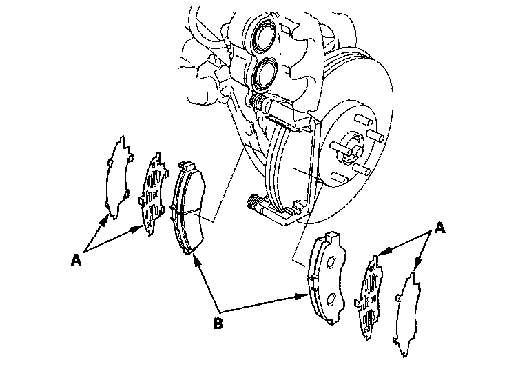 5. Remove the pad shims (A) and brake pads (B).