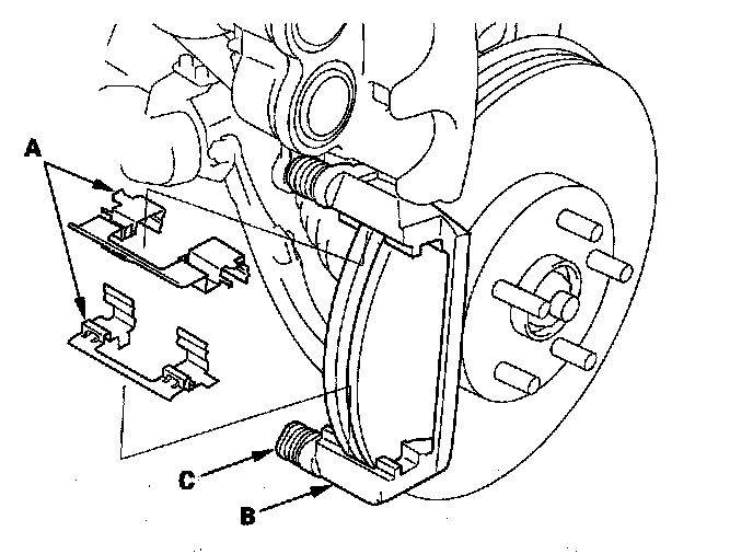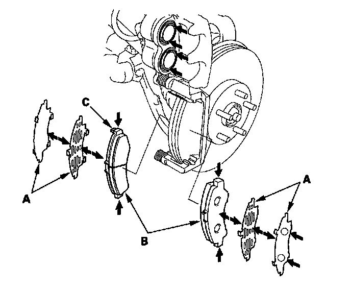 14. Install the brake pads and pad shims correctly. Install the brake pad with the wear indicator (C) on the upper inside. If you are reusing the brake pads, always reinstall the brake pads in their original positions to prevent a momentary loss of braking efficiency.