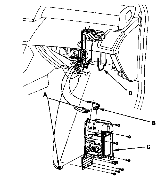6. Disconnect the connectors (A) from the evaporator temperature sensor and the power transistor, then remove the connector clip (B). Remove the self-tapping screws, the expansion valve cover (C), and the seal (D).