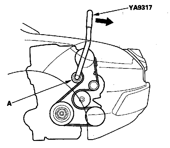 1. Move the auto-tensioner (A) using the belt tension release tool to relieve tension from the drive belt, then remove the drive belt.