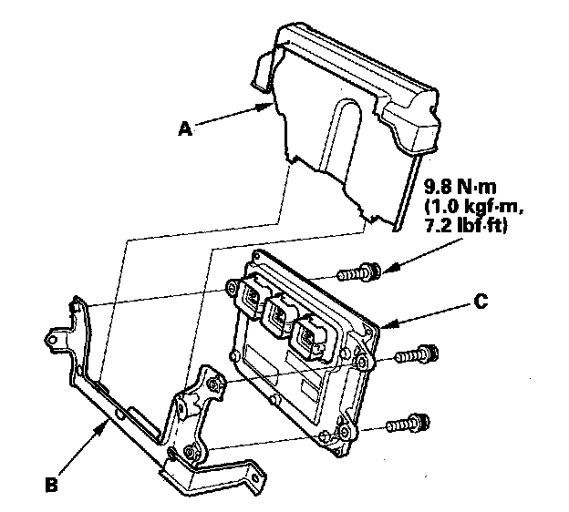 10. Remove the cover (A) and the bracket (B) from the PCM (C).