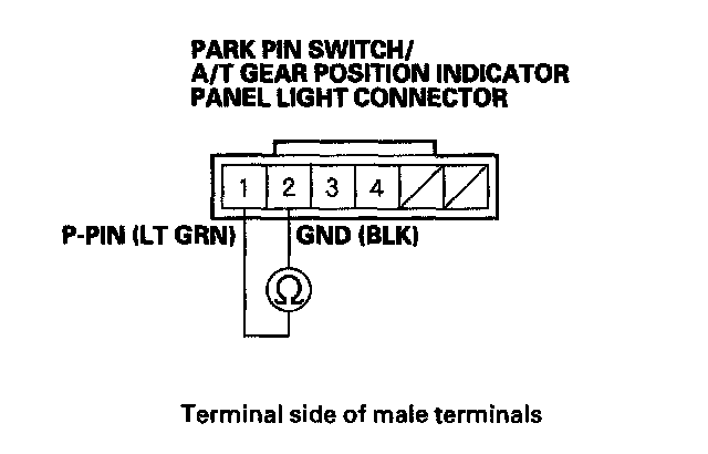 8. Check for continuity between the park pin switch/A/T gear position indicator panel light connector terminal No. 1 and body ground.