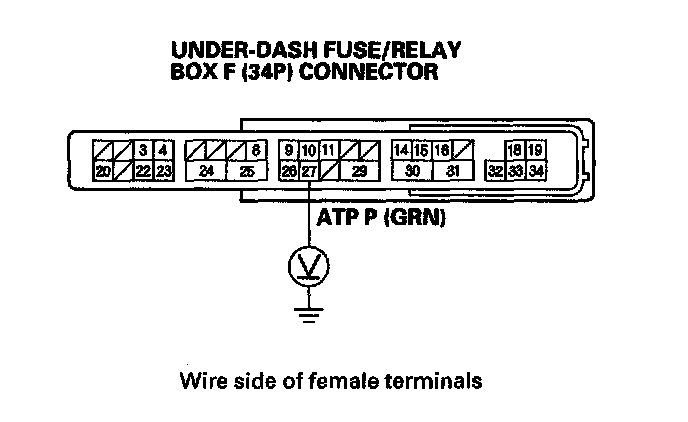 13. Measure the voltage between the under-dash fuse/relay box F (34P) connector terminal No. 27 and body ground.