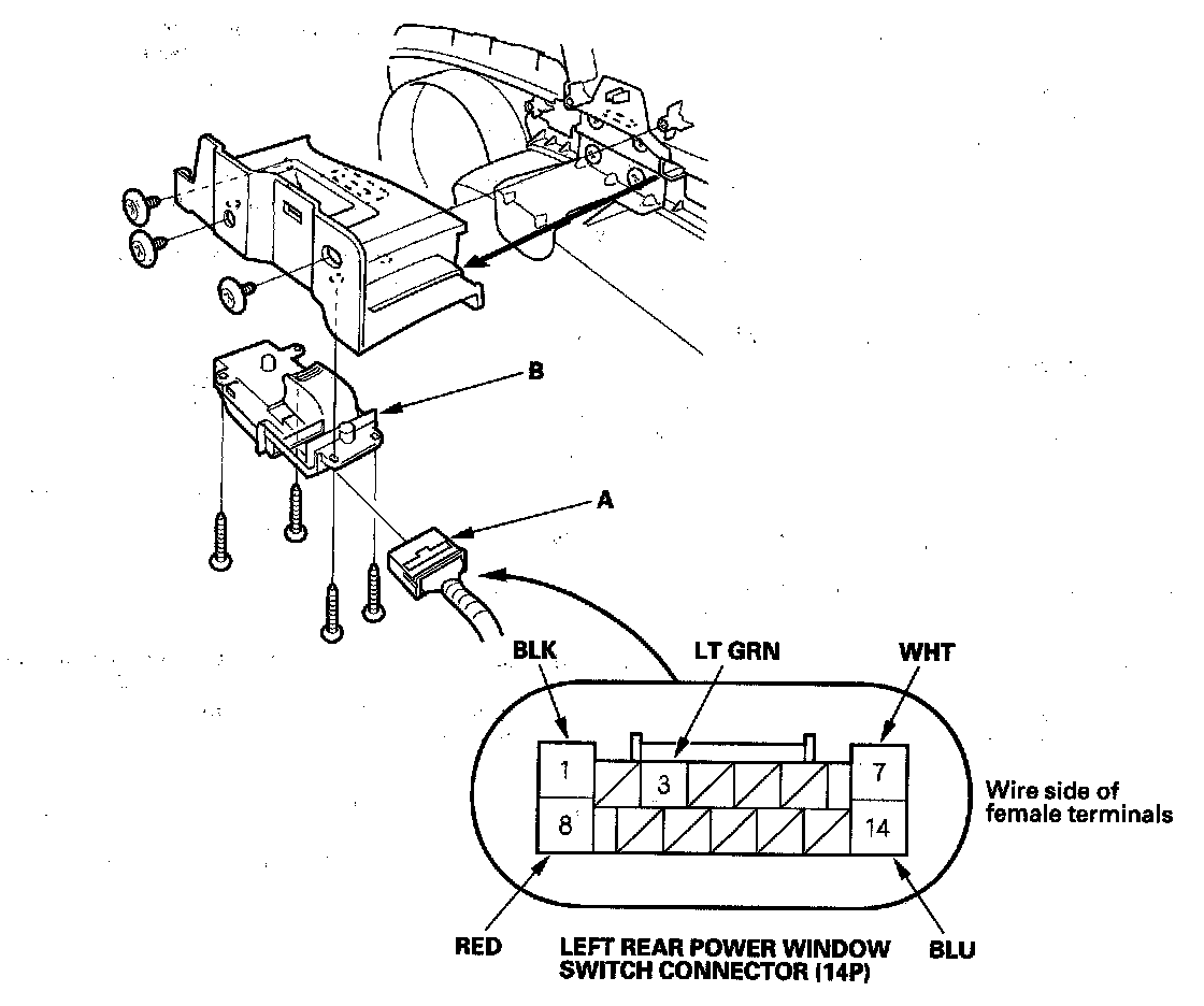 2. Disconnect the 14P connector (A) from the left rear power window switch (B).
