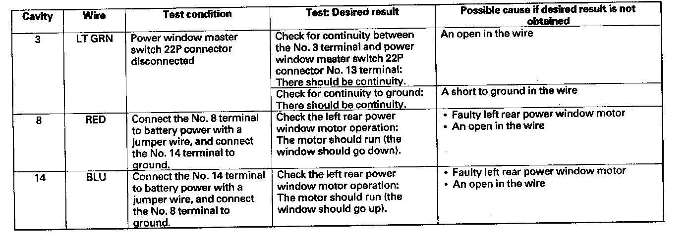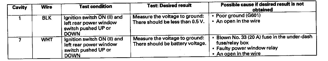 5. Reconnect the connector to the left rear power window switch, and make these input tests at the connector.