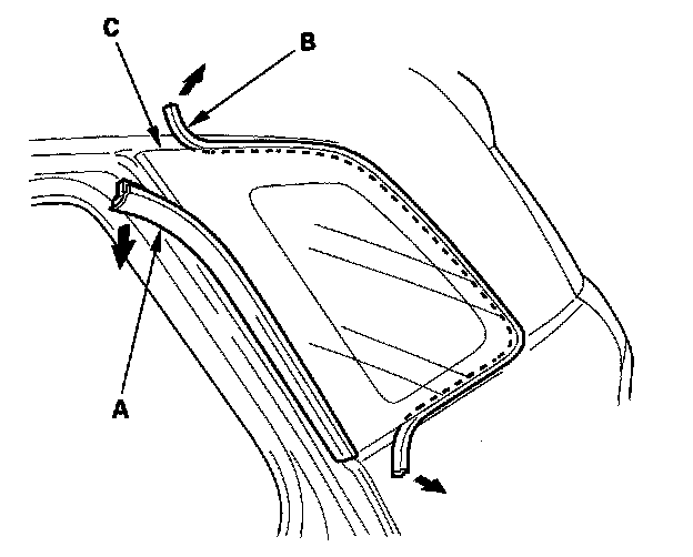 13. Attach the molding quarter seal (B) and front seal (C) with adhesive tape to the inside face of the quarter glass.