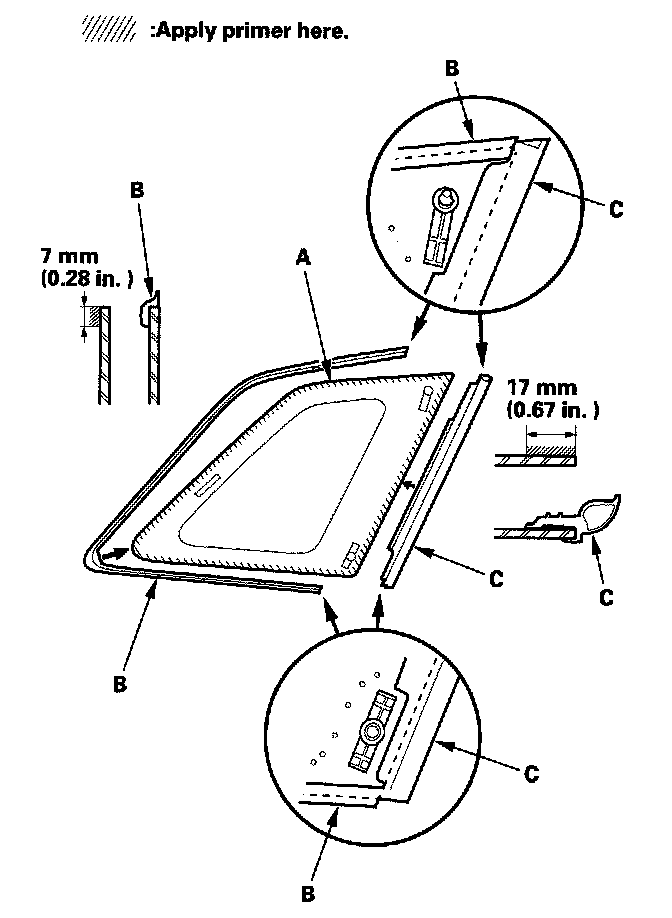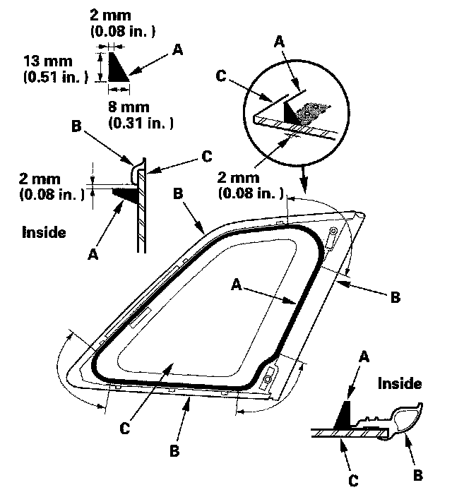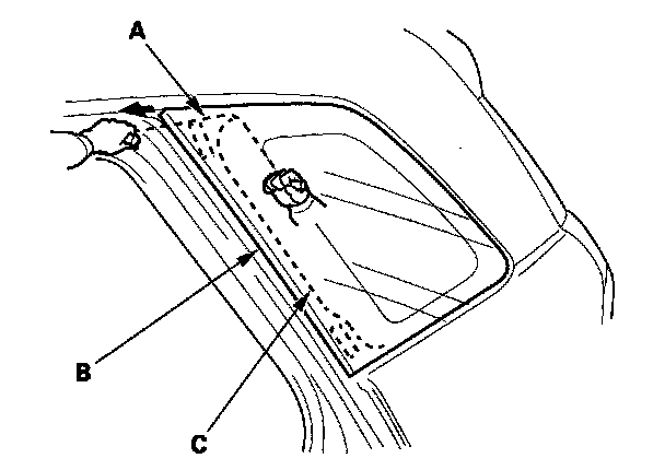 17. Pack adhesive into the cartridge without air pockets to ensure continuous delivery. Put the cartridge in a caulking gun, and run a bead of adhesive (A) along the seals (B) as shown. With the printed dots on the quarter glass (C) as a guide, apply the adhesive to the upper and lower corner portions of the quarter glass. Apply the adhesive within 30 minutes after applying the glass primer. Make a slightly thicker bead at each corner.