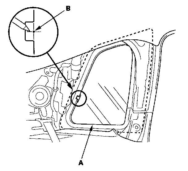 9. Set the quarter glass (A) in the opening, and center it. From inside the vehicle, make an alignment mark (B) to the quarter glass where the rear clip will be installed with a grease pencil. Be careful not to touch the glass where adhesive will be applied.