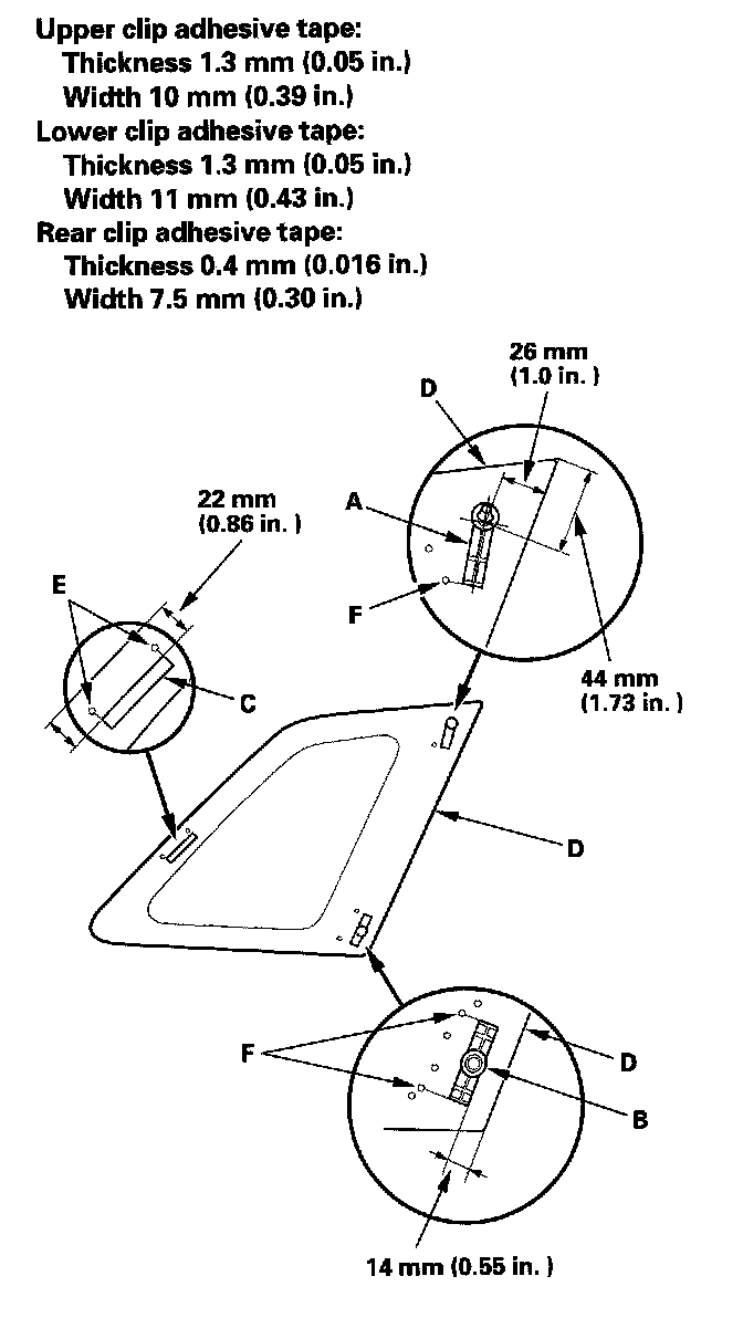11. Attach the upper clip (A), lower clip (B), and rear clip (C) with adhesive tape to the inside face of the quarter glass (D) as shown.