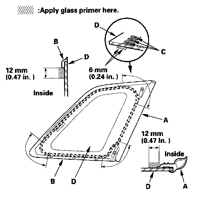 - With the printed dots (C) on the quarter glass (D) as a guide, apply the glass primer to the front portion of the quarter glass.