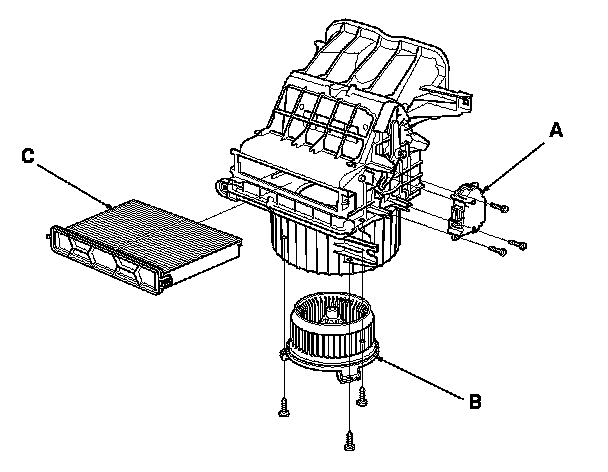 - The recirculation control motor (A), blower motor (B) and the dust and pollen filter (C) can be replaced without removing the blower unit.