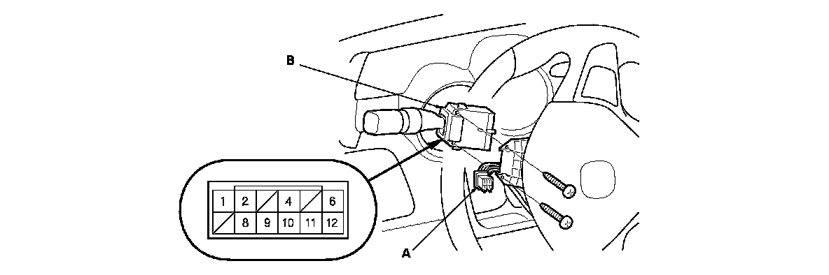 2. Disconnect the 12P connector (A) from the combination light switch (B).