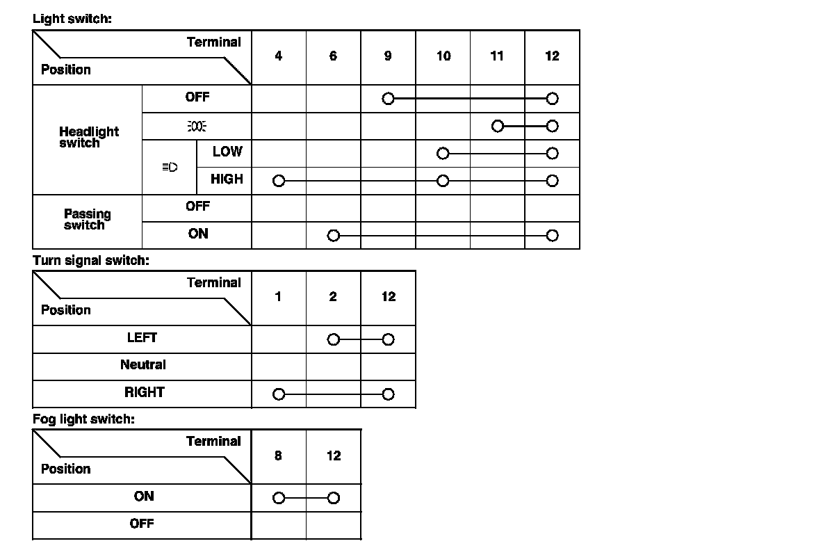 - If the terminals look OK, check for continuity between the terminals in each switch position according to the tables.