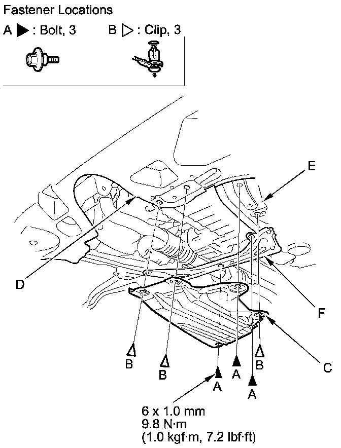 1. Remove the bolts (A), and the clips (B), then remove the front undercover (C) from the splash shield (D), the front suspension subframe (E), and the front subframe stiffener (F).