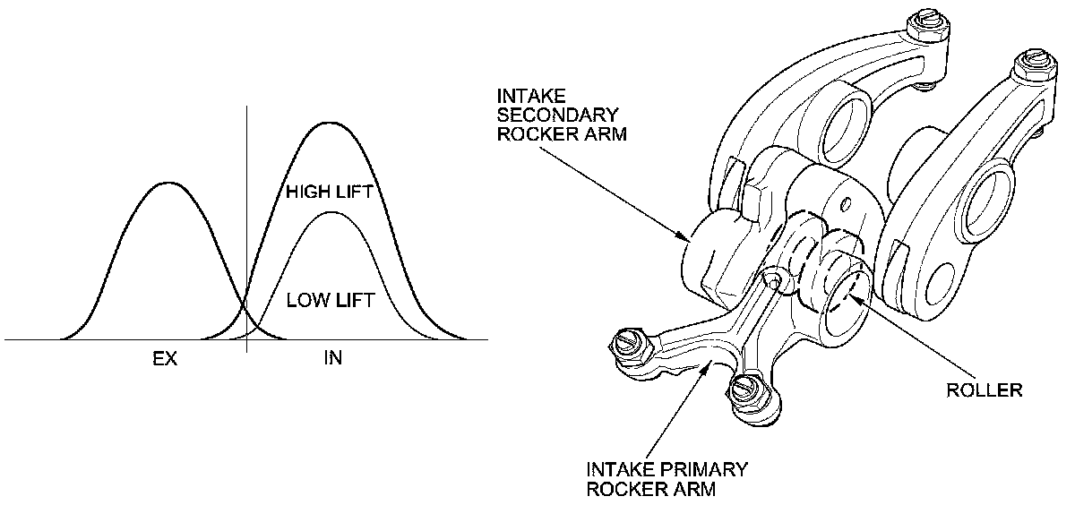 - The intake valve side has primary and secondary rocker arms. These rocker arms are locked and separated to change the cam profile by switching the oil passages. Roller rockers are used to minimize mechanical friction.