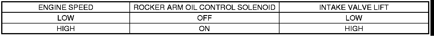 The rocker arm oil control solenoid is turned off by the PCM. Oil pressure from the rocker arm oil control valve does not enter the rocker shaft. The intake primary and secondary rocker arms are separated by a return spring and lifted by the low lift cam lobe.