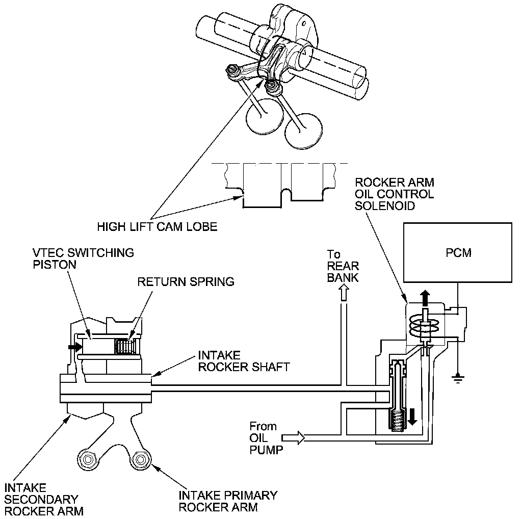 - The VTEC system oil pressure is switched by the rocker arm oil control valve changing the hydraulic circuit. The rocker arm oil control valve is controlled by the rocker arm oil control solenoid. The rocker arm oil pressure switch detects VTEC system oil pressure and sends this information to the PCM.
