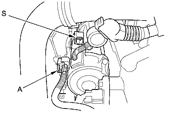 10. Make sure the shift lever is in P or N, then disconnect the connector (A) from the starter S terminal. Connect a jumper wire from the battery positive terminal to the S terminal.