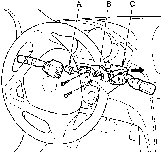 2. Disconnect the combination light switch 10P connector (A), and dashboard wire harness 8P connector (B) from the wiper/washer switch (C).