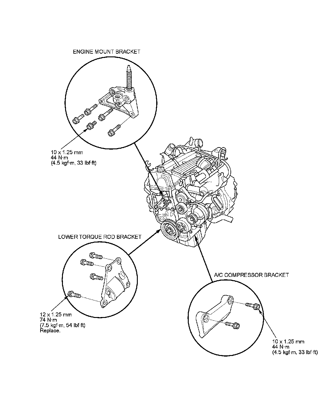 1. Install the engine mount bracket and the accessory brackets then tighten their bolts to the specified torque.