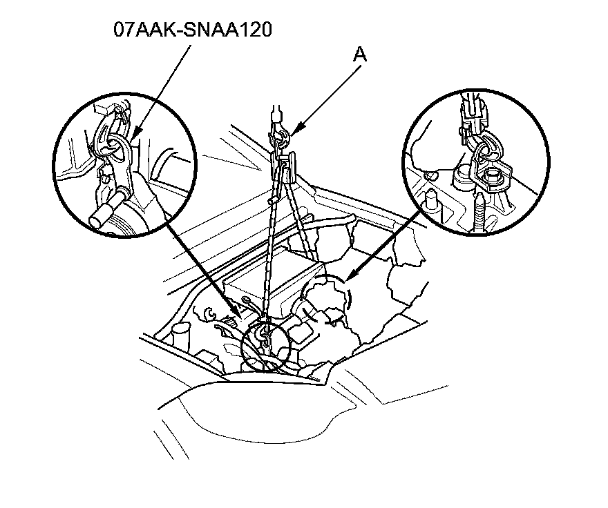 2. Position the engine/transmission under the vehicle. Be sure that they are properly aligned. Carefully lower the vehicle until the engine/transmission is properly positioned in the engine compartment. Make sure the vehicle is not resting on any part of the engine/transmission. Support the engine/transmission with a chain hoist (A) and carefully raise the engine/transmission into place.
