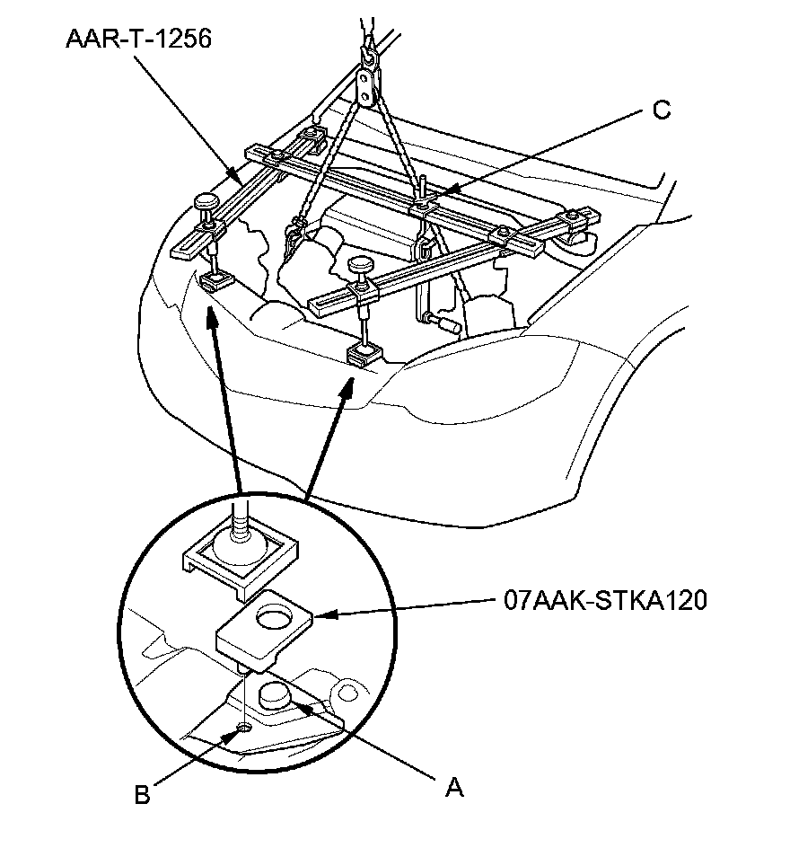 4. Place the mount pads over the hood edge cushions (A), and align the pins with the clip hole (B). Remove the lids from both sides of the cowl cover. Install the engine support hanger (AAR-T-1256) onto the vehicle as shown, and attach the hook to the engine support eyelet. Tighten the wing nut (C) by hand to lift and support the engine/transmission.